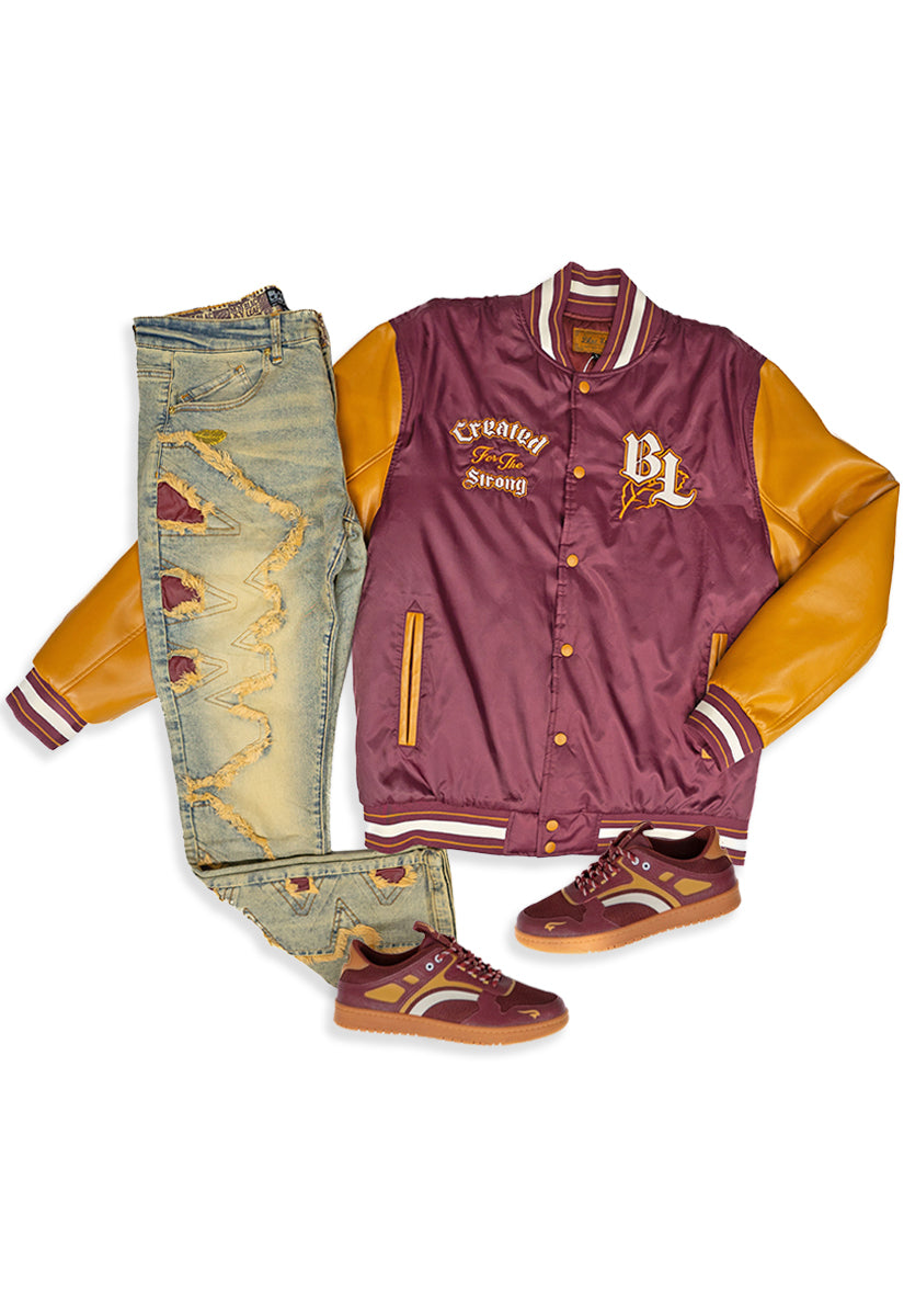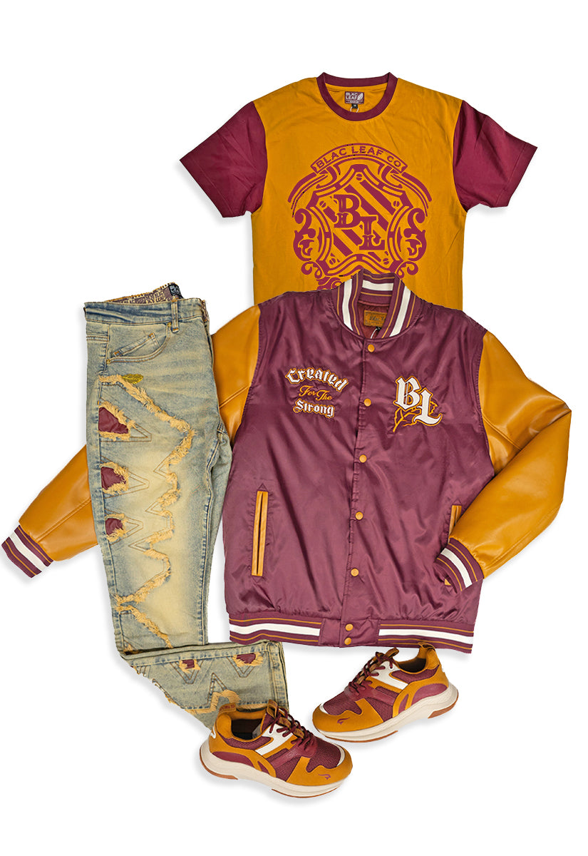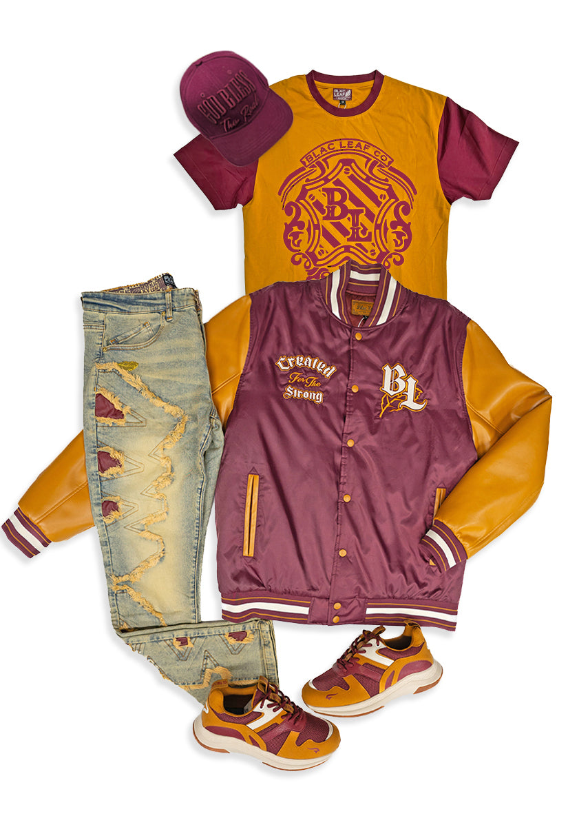 Timeless Embroidered Brown Leaf Shirt, Denim Jeans, Trucker Hat and Sneakers Bundle