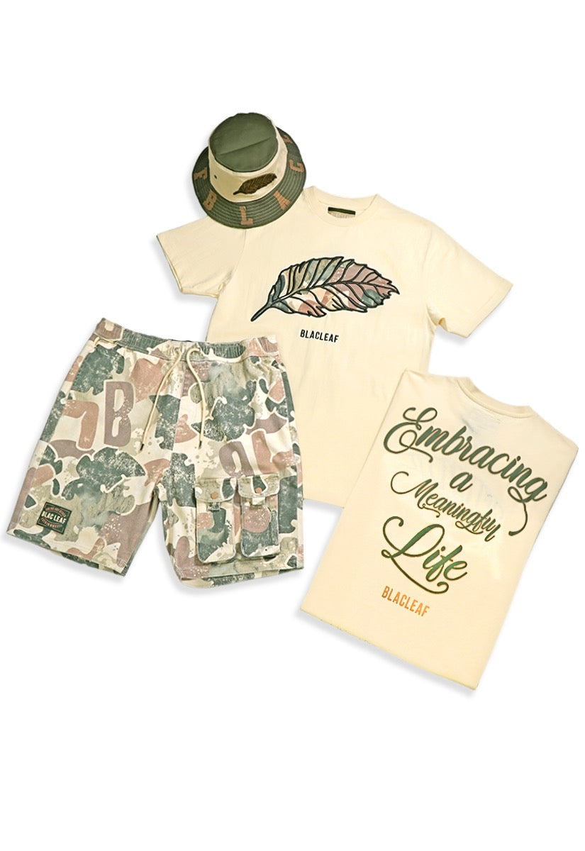 Embracing Life T-Shirt, Camo Shorts and Bucket Hat Bundle Include: