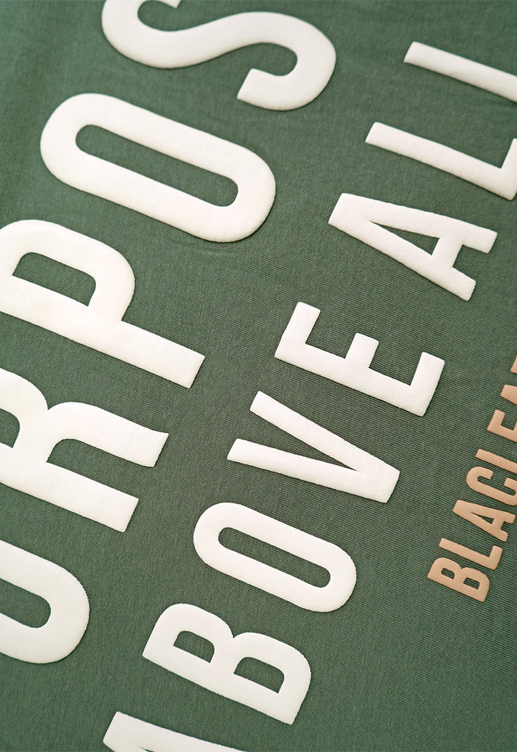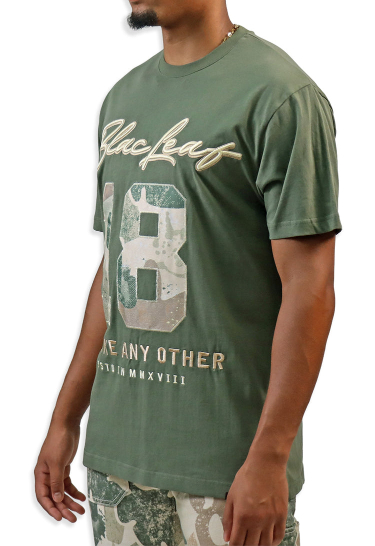 The Purpose Above All Shirt in Military Olive is anything but ordinary. Featuring "BLAC LEAF" embroidered in creamy tones on the front, it proudly showcases an impressive Number 18 in camouflage design framed by cream stitching. Just below, the phrase "UNLIKE ANY OTHER" in khaki adds a fun, bold touch. This shirt combines rugged style with a playful twist, making it perfect for those who want to stand out while keeping it cool and casual. Whether you're out on an adventure or just relaxing, this tee brings purpose and personality together effortlessly. Military Olive Color.