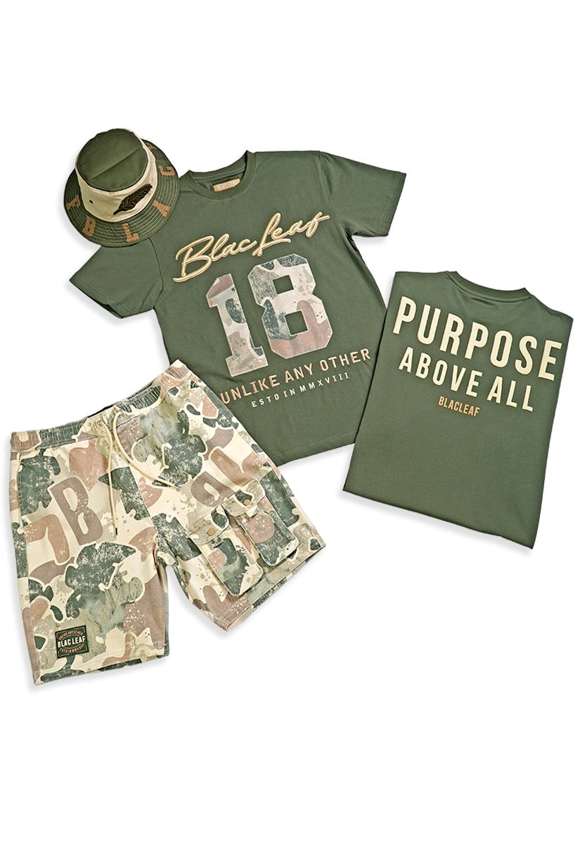 Purpose Above All Shirt, Camo Shorts and Bucket Hat Bundle Include