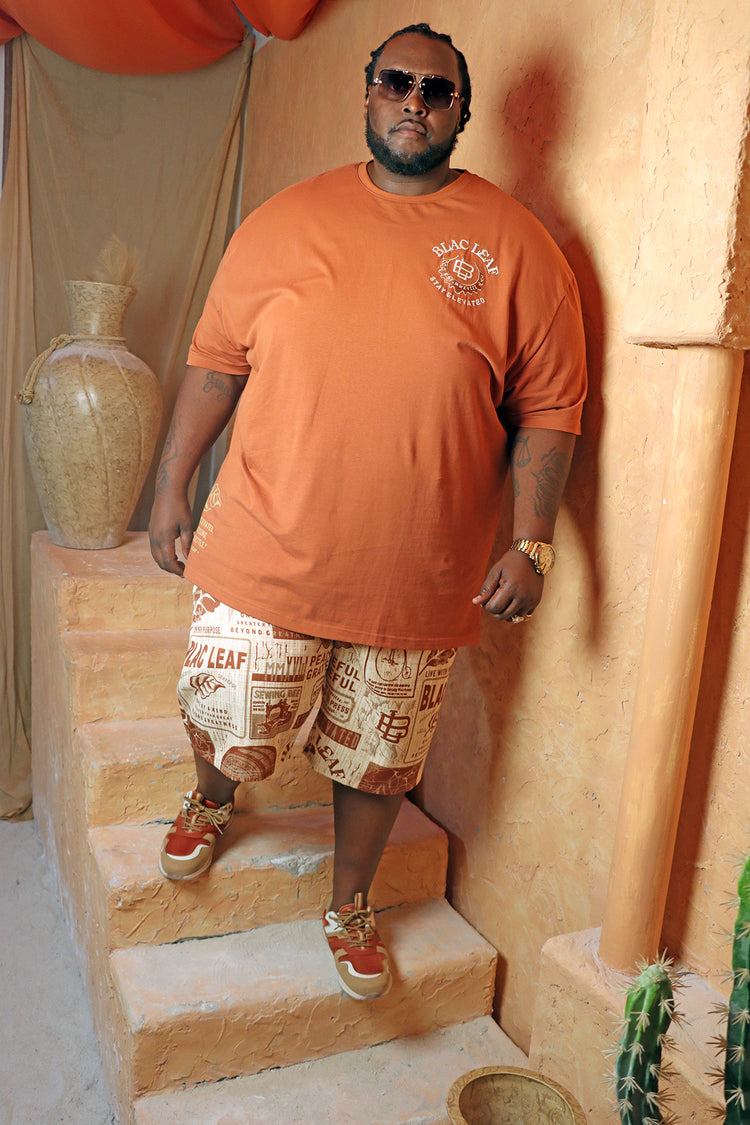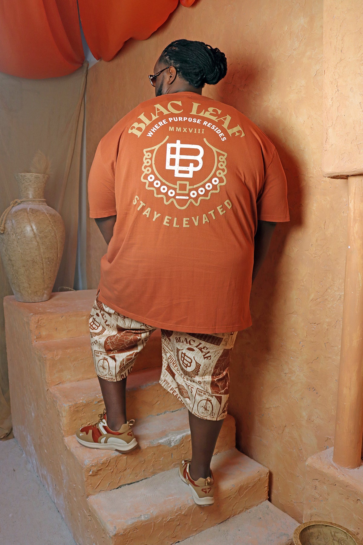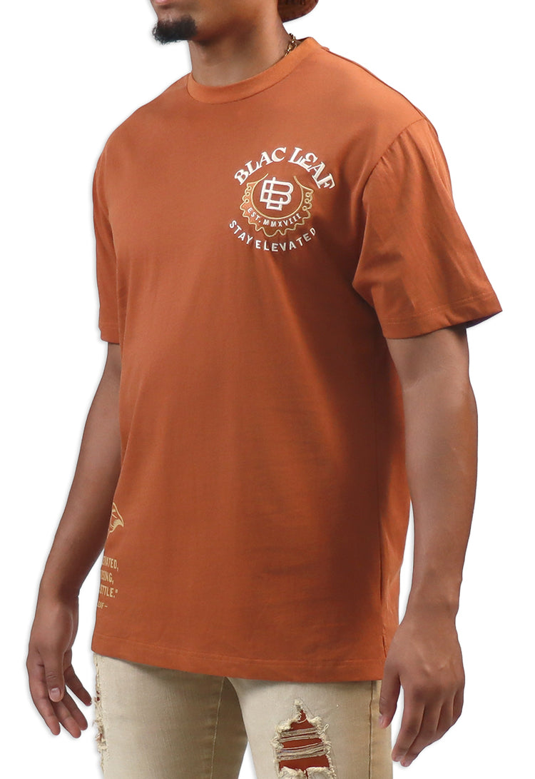 The Stay Elevated T-Shirt in vibrant rust color is your go-to for style with a laid-back vibe. Featuring a large, bold Blac Leaf BL logo on the back with the uplifting "Stay Elevated" message, it’s a perfect reminder to keep your spirits high. The front sports a smaller, embroidered version of the same iconic logo on the top left, adding a subtle yet stylish touch. Soft, comfortable fabric makes it easy to wear all day, effortlessly blending casual cool with a playful flair. Elevate your wardrobe and mood in one effortless tee! Complete Rust Color Shirt.
