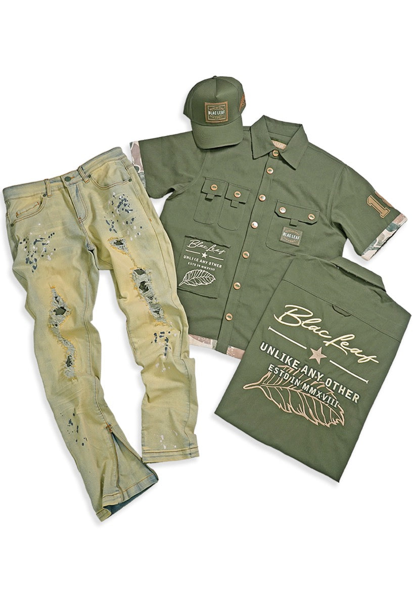 Unlike Any Other Button Up Shirt, Denim Jeans and Trucker Hat Bundle Include: