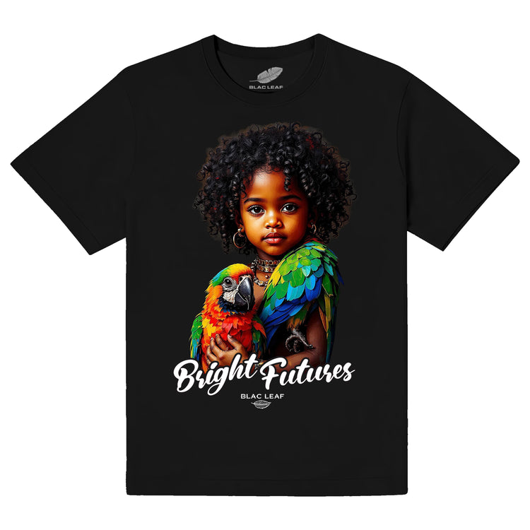 The Bright Futures Black Shirt features a striking design of a young girl holding a vibrant, colorful macaw parrot, bringing a playful splash of color to the classic black fabric. With the words "Bright Futures" boldly displayed at the bottom, this shirt is all about optimism and joy. Perfect for adding a fun and lively touch to your everyday look, it celebrates creativity and hope in a stylish and unique way. Embrace the bright side with this charming and spirited shirt!