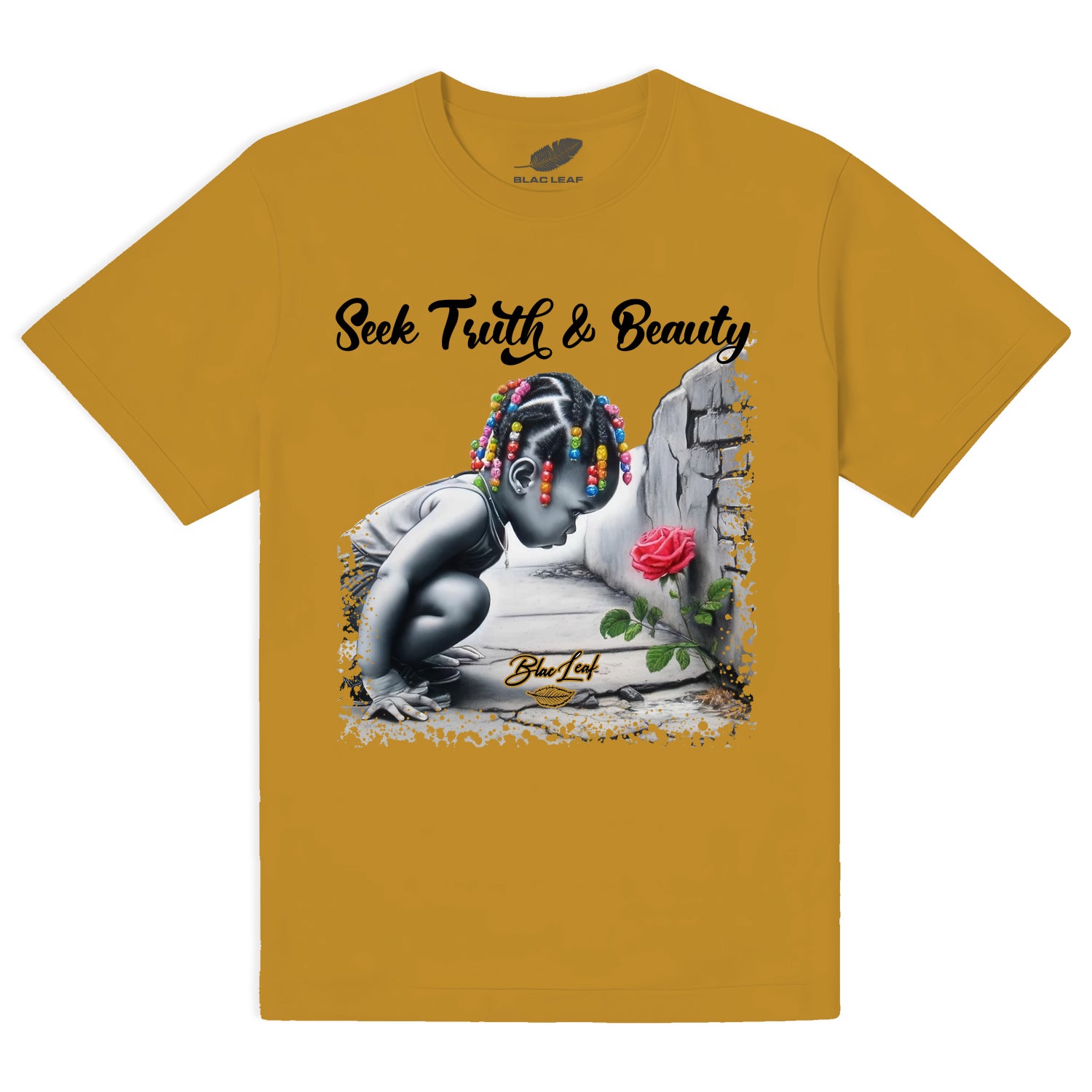 Discover the perfect blend of artistic expression and everyday style with our SEEK TRUTH & BEAUTY WHEAT SHIRT. This striking all-black tee features a captivating illustration of a young girl gazing thoughtfully at a delicate pink rose against a textured brick wall and sidewalk backdrop. The contrast between the vibrant bloom and the urban setting creates a poetic moment frozen in time—a visual reminder to pause and appreciate beauty in unexpected places. Crafted for those who appreciate meaningful design, this shirt sparks conversations and invites interpretation. Whether you're making a statement about finding wonder in the mundane or simply love wearable art, this piece brings personality and depth to your wardrobe. Perfect for anyone who believes that fashion should tell a story.