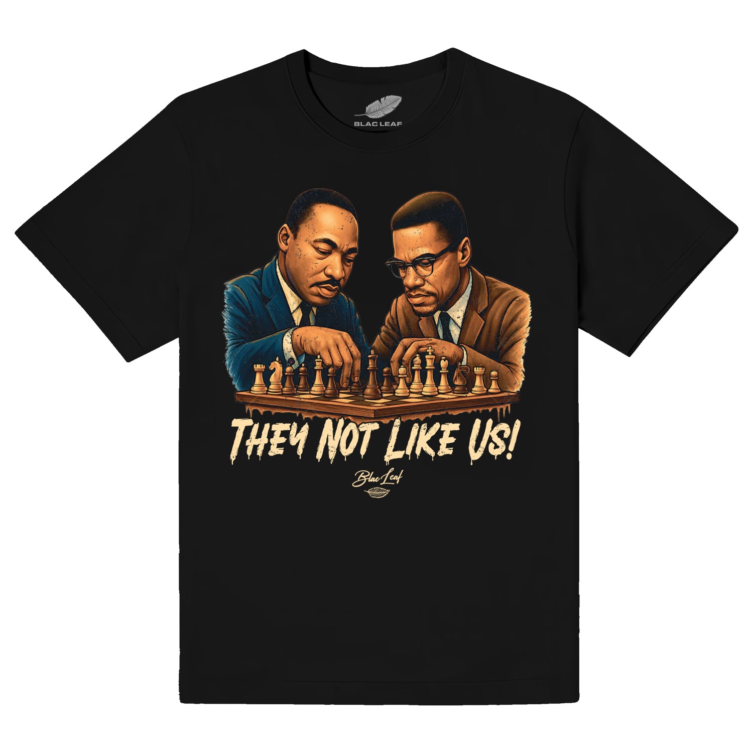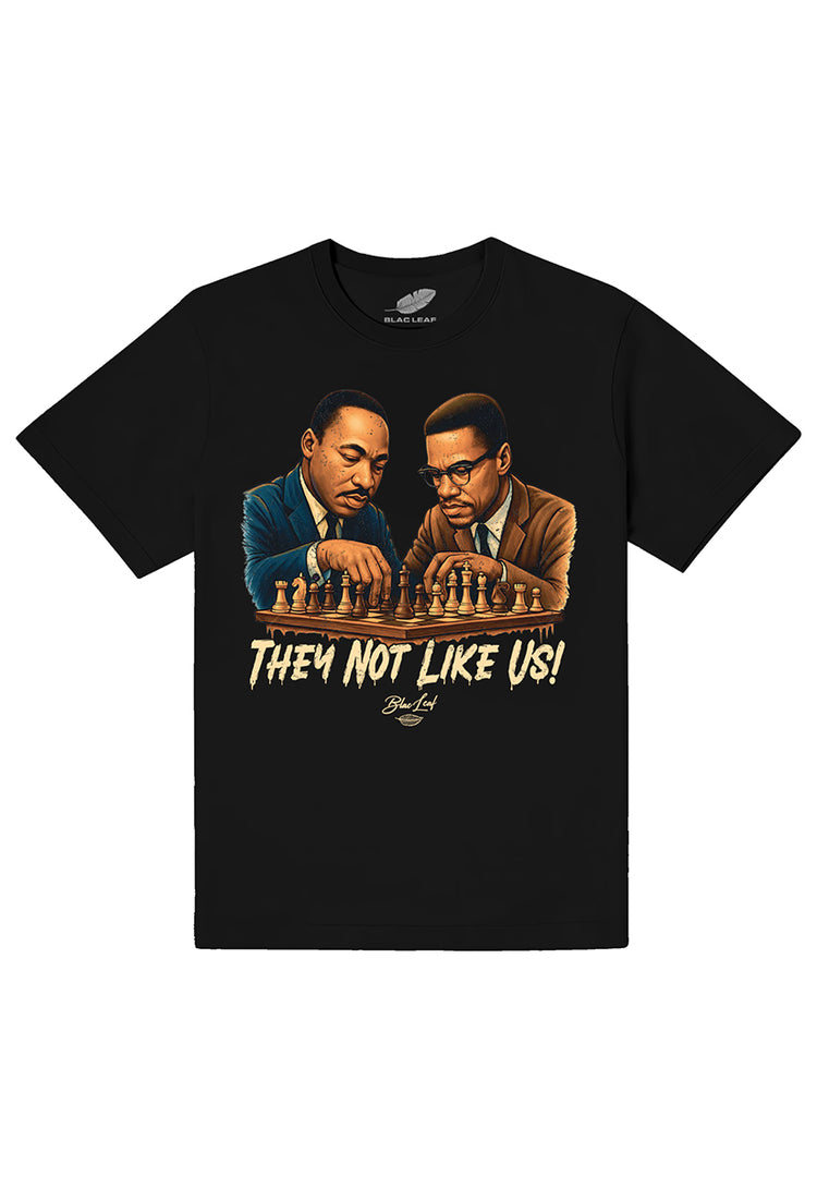 Celebrate bold history and sharp style with the THEY NOT LIKE US Black Shirt. Featuring a playful design of Martin Luther King Jr. and Malcolm X engaged in an intense game of chess, this shirt captures the spirit of strategic minds and relentless determination. The phrase "THEY NOT LIKE US" anchors the artwork, adding a fun yet powerful statement to your wardrobe. Perfect for those who appreciate iconic figures and clever visuals, this shirt invites conversation and shows your fearless side with a touch of wit.