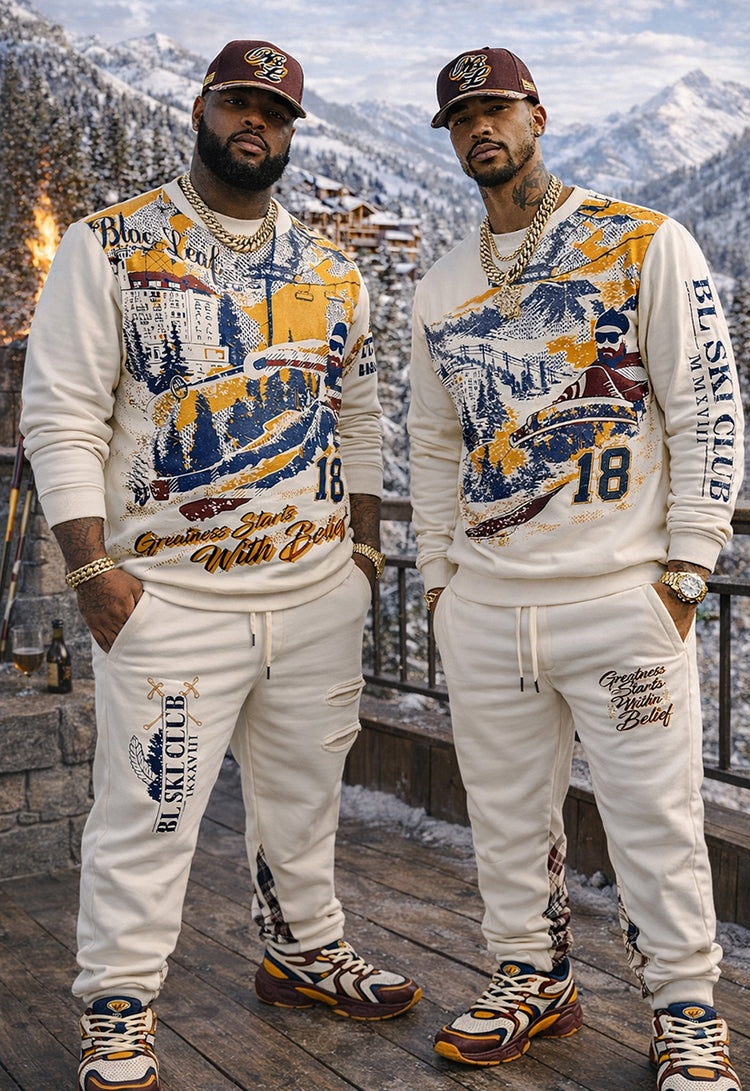 Introducing the BL Elite Crewneck—where alpine vibes meet street style. This cream-colored essential features the iconic Blac Leaf Hotel Ski Resort graphic sprawling across the back, complete with a dynamic skier carving through the slopes. The left sleeve showcases "Greatness Starts with Belief" in rich burgundy lettering, a daily reminder to embrace your potential. Navy BL SKI CLUB branding runs down the right side, establishing your membership in an exclusive crew of trendsetters. Perfect for après-ski lounging, weekend hangouts, or anyone who believes that style and inspiration go hand in hand. Elevate your wardrobe with this statement piece that celebrates both adventure and ambition. Cream crewneck.