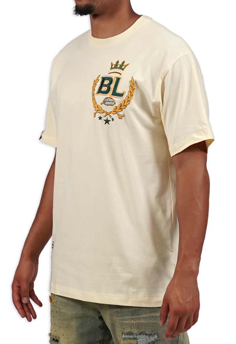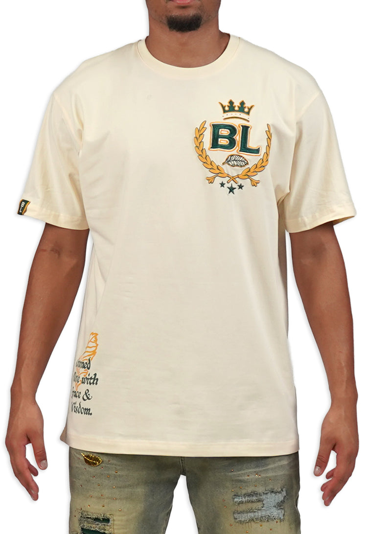 Step into royalty with the CROWNED KINGS T-Shirt in Cream. This premium tee features an embroidered left chest design showcasing the iconic Blac Leaf wreath with a majestic crown, accented with golden stone details that catch the light just right. Flip it around and you'll find the showstopper—a bold, full-back gel print of the CROWNED KINGS logo that demands attention. The cream colorway keeps things fresh and versatile, making it easy to pair with your favorite fits. Whether you're repping the lifestyle or just vibing with elevated streetwear, this shirt lets you wear your crown with confidence and style. ALL CREAM SHIRT.