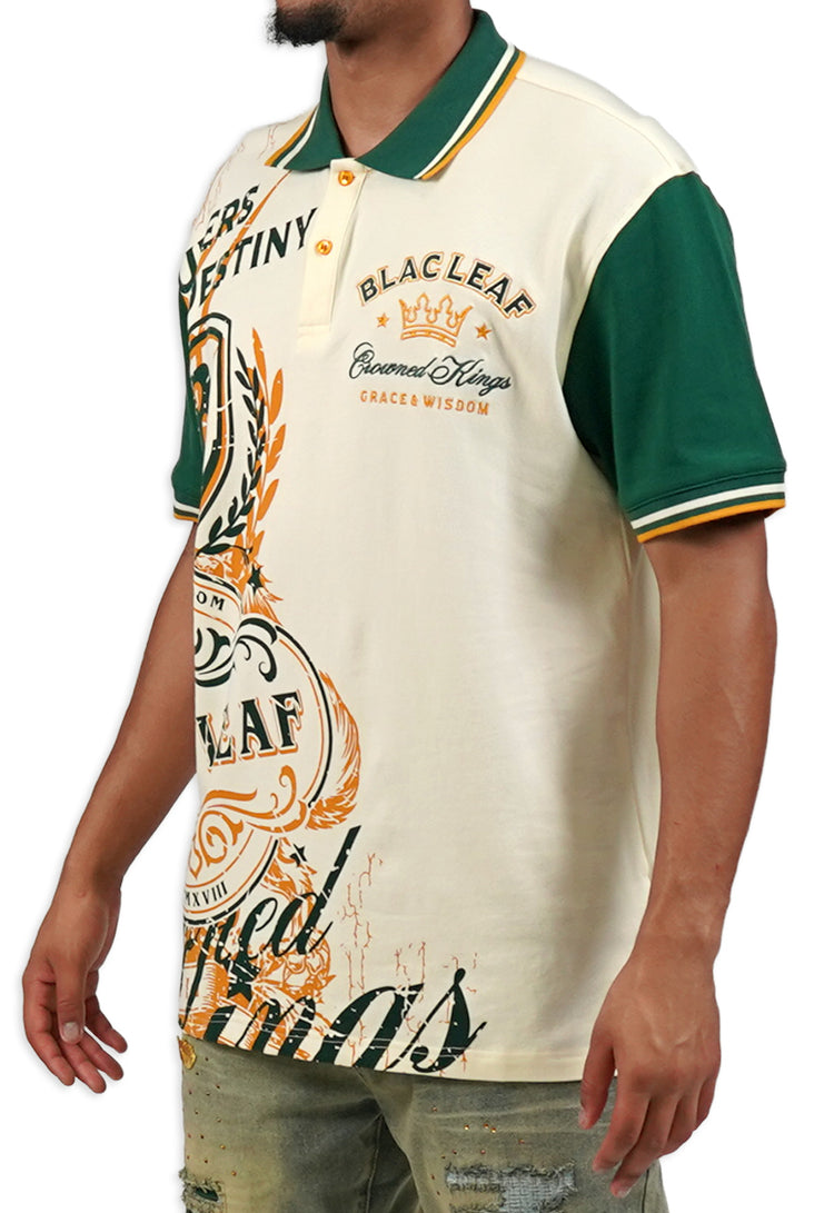 Step up your style game with the GRACE & WISDOM POLO SHIRT, where timeless sophistication meets bold statement-making. This cream and green polo features the iconic BLAC LEAF Crowned Kings logo embroidered in rich green and gold on the left chest, paired with a striking large-format gel print of the Ruler Destiny BL logo on the right side. Perfect for those who wear their values on their sleeve—literally. Whether you're heading to a casual gathering or want to make a confident impression, this polo delivers comfort and character in equal measure. Elevate your everyday wardrobe with a piece that speaks volumes about who you are. CREAM POLO WITH SLEEVES AND COLLAR IN GREEN.