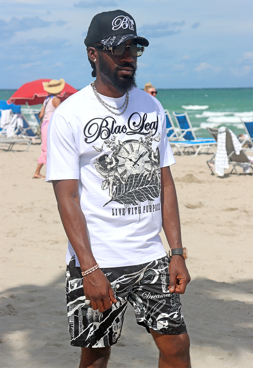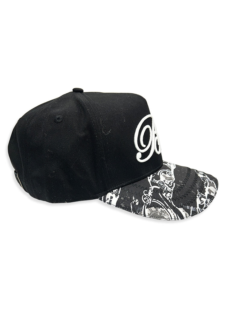 Calling All Dreamers Trucker Hat is your ticket to turning heads with bold, unapologetic style. This all-black cap features a striking white-stitched embroidery design: a fancy B Script paired with a block-letter L outline, both crowned with a small "18" in the corner. But here's where it gets really fun—the visor is a showstopper. A collage of vintage newspaper clippings, antique advertisements, and leafy elements in grey, white, and black creates an eye-catching mixed-media aesthetic. Nestled within that retro patchwork is the Blac Leaf script signature logo, tying the whole look together. Perfect for dreamers, rebels, and anyone ready to make a statement.