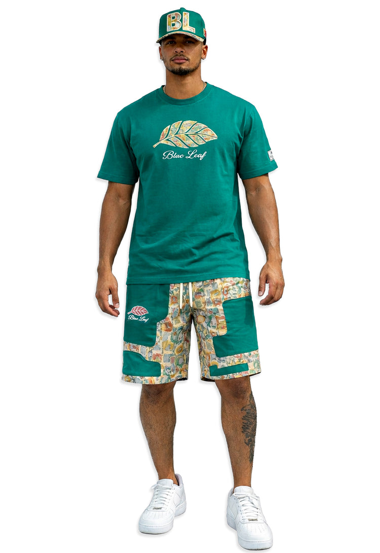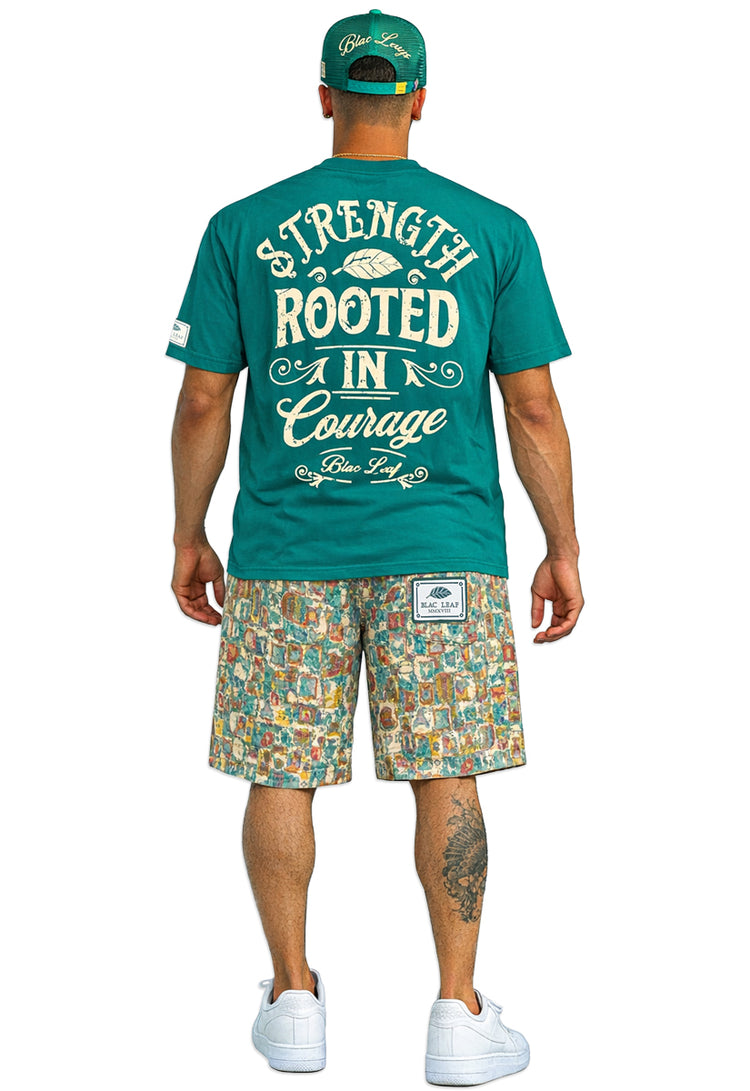 Premium tee featuring a striking design that celebrates resilience and inner strength. The front showcases a detailed tapestry leaf motif in black embroidery, while the back displays a bold cream gel puff print reading "STRENGTH ROOTED IN COURAGE." Crafted in a rich green turquoise colorway, this shirt combines comfort with meaningful style—perfect for those who wear their values.