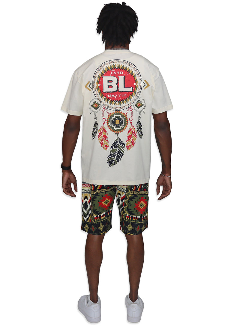 Catch your dreams in style with our Dream Catcher T-Shirt—a wearable work of art that blends mystique with modern edge. Crafted from all-natural fabric, this tee features our iconic BL logo embroidered in bold red outline with black detailing, paired with Roman numerals MMXVIII nestled inside a double arrow design. A cream-colored dream catcher print adorned with intricately embroidered feathers graces the left chest, while the back showcases a showstopping oversized BL logo dream catcher design complete with feather accents—all rendered in eye-catching gel print. Whether you're channeling spiritual vibes or just love statement pieces that spark conversation, this shirt delivers personality with every wear. Perfect for those who dare to dream bigger and dress bolder.