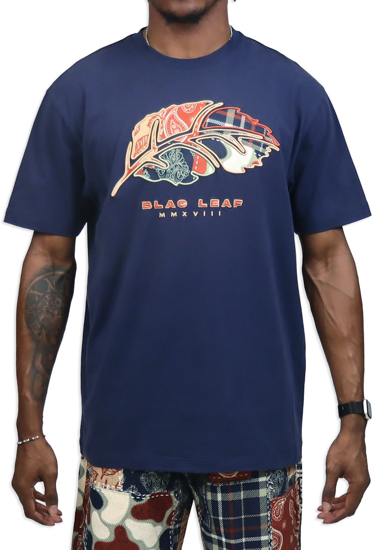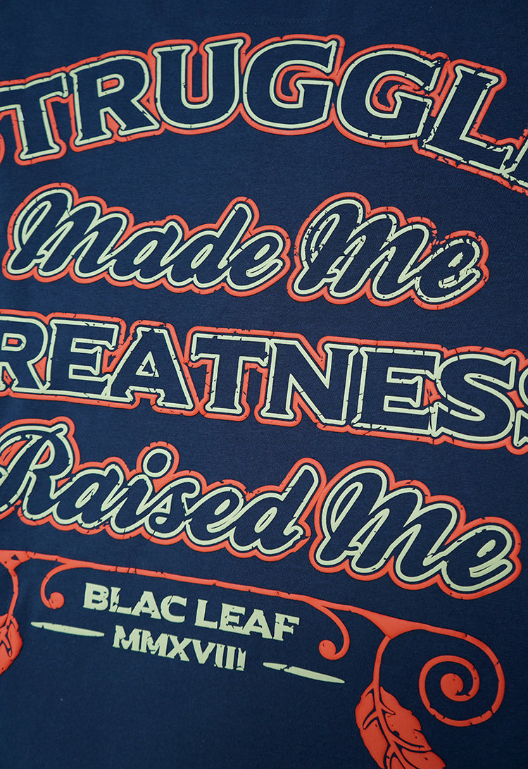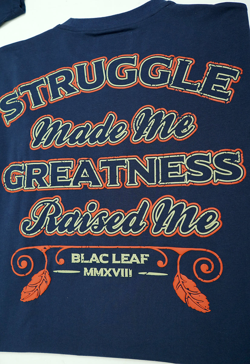 Greatness Made Me T-Shirt Step into bold style with this statement piece that tells your story. Crafted in rich navy, this tee features an oversized leaf design rendered in intricate plaids with antique-inspired detailing, all outlined in warm khaki and rust embroidered stitching. The front showcases "BLAC LEAF" embroidered in rust with khaki accents, accompanied by Roman numerals MMXVIII beneath the iconic leaf motif. Flip it around and discover the powerful message on the back: "STRUGGLE Made Me Greatness Raised Me," rendered in sage and rust gel print for added dimension. Perfect for those who wear their journey with pride, this tee blends artistic craftsmanship with meaningful messaging. A versatile wardrobe essential that sparks conversation and celebrates resilience.