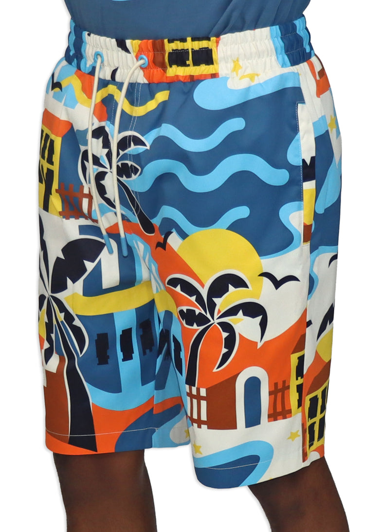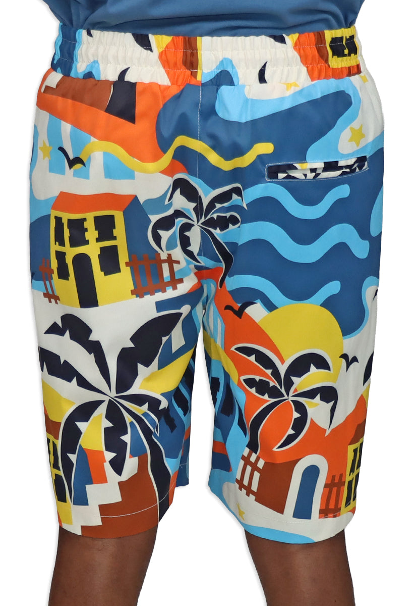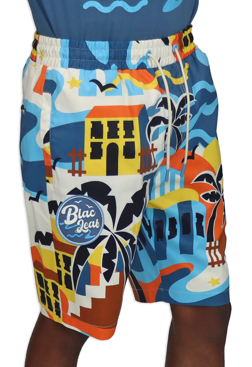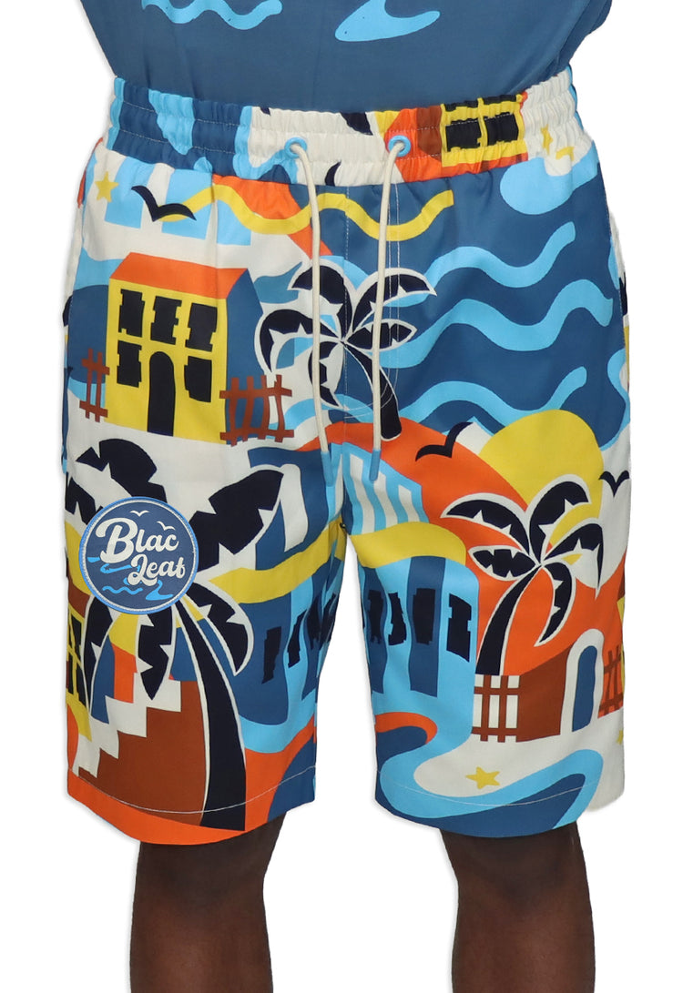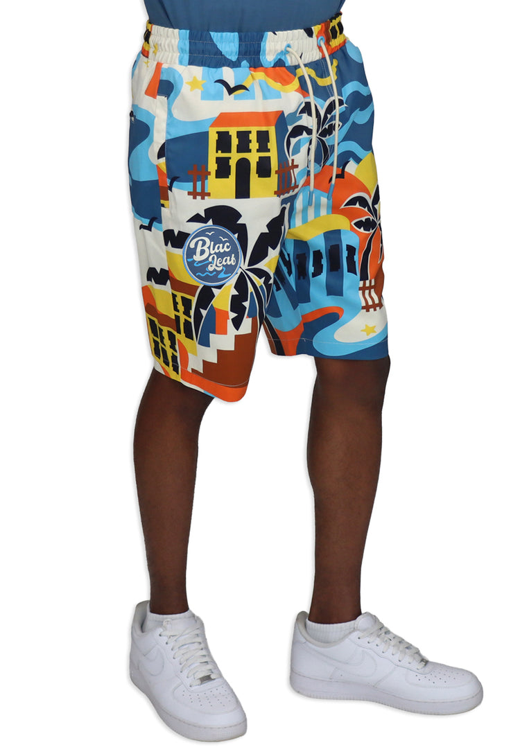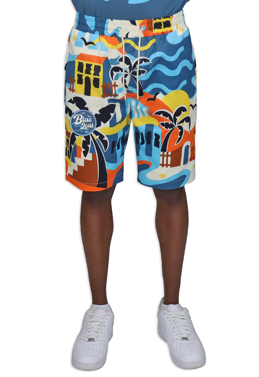 Life is Wonderful AOP Shorts capture the essence of carefree coastal living with an eye-catching all-over print design. Featuring a bold palm tree as the centerpiece, the shorts showcase a retro-inspired hotel backdrop rendered in warm oranges, yellows, and creams that instantly evoke those golden vacation vibes. Medium blue beach waves dance along the right leg, while a signature blue "Blac Leaf" Beach Logo patch anchors the design with authentic beach culture credentials. Cream-colored drawstrings add a polished finishing touch to this statement piece. Whether you're heading to the shore or just channeling that perpetual vacation mindset, these shorts deliver maximum personality and comfort for anyone ready to embrace their inner beach bum.