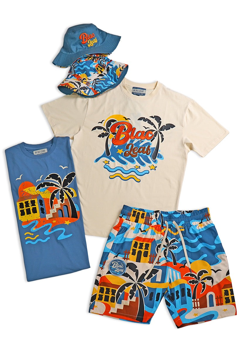 Life is Wonderful T-Shirt, Paradise T-Shirt, AOP Shorts and Bucket Hat Bundle Include: